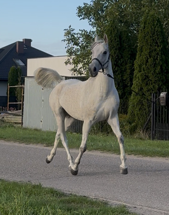 Chodzi w siodle trenowany pod kątem ujeżdżenia. Umie ustępowania w trzech chodach, łopatki, zaczyna naukę ciągów, przejścia step-galop-step, kontrgalopy.