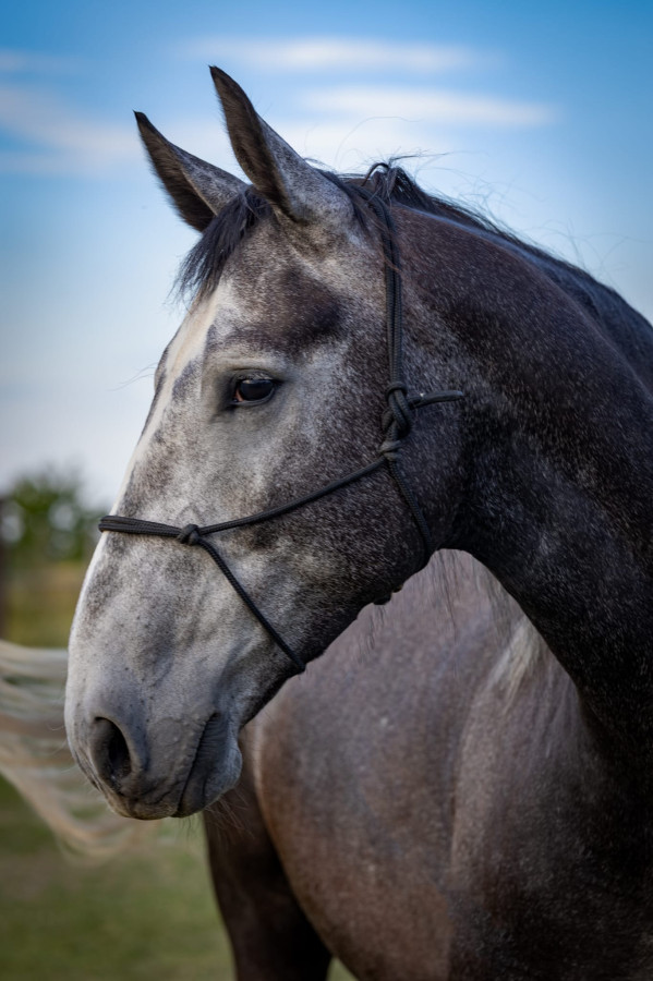 Dzielnie znosił również pracę z różnego typu „straszakami”. Na zajeżdżanie zabrakło czasu, więc koń od zeszłego lata stoi na padoku i korzysta z życia w stadzie. Jest przesympatyczny, bardzo lubi kontakt z człowiekiem i zabiegi pielęgnacyjne.