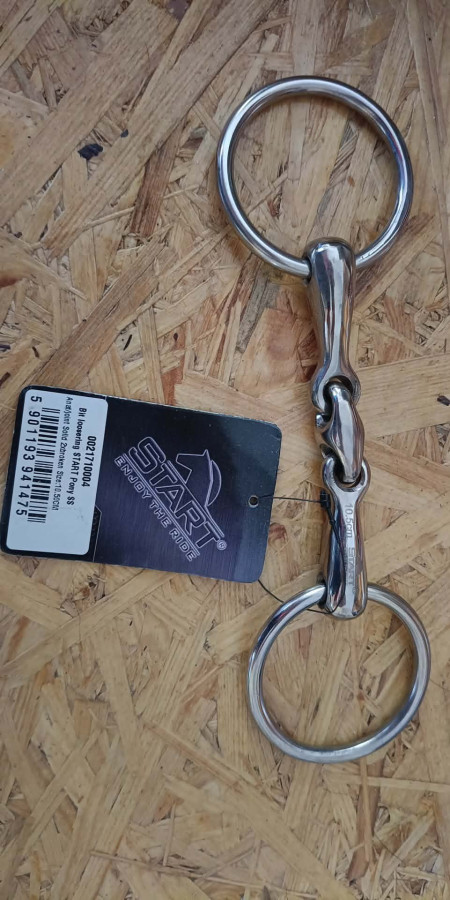 Podwójnie łamane wędzidło ze stali nierdzewnej z anatomicznym łącznikiem. Dedykowane dla kucy. Grubość 14 mm, średnica kółek 55mm