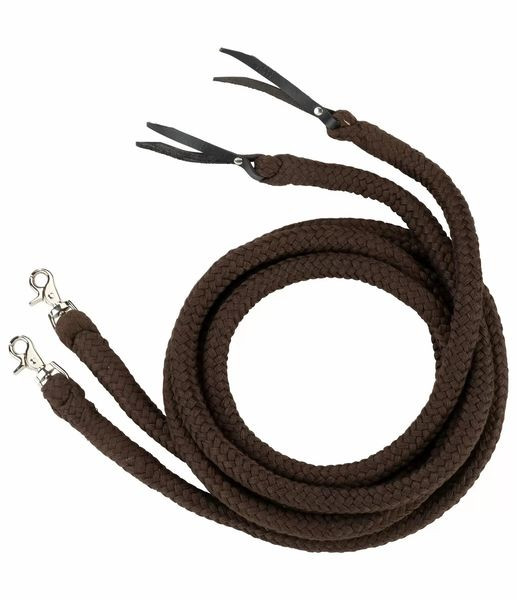 Bawełniane wodze dzielone ze skórzanymi końcówkami. Długość 2,4 m.