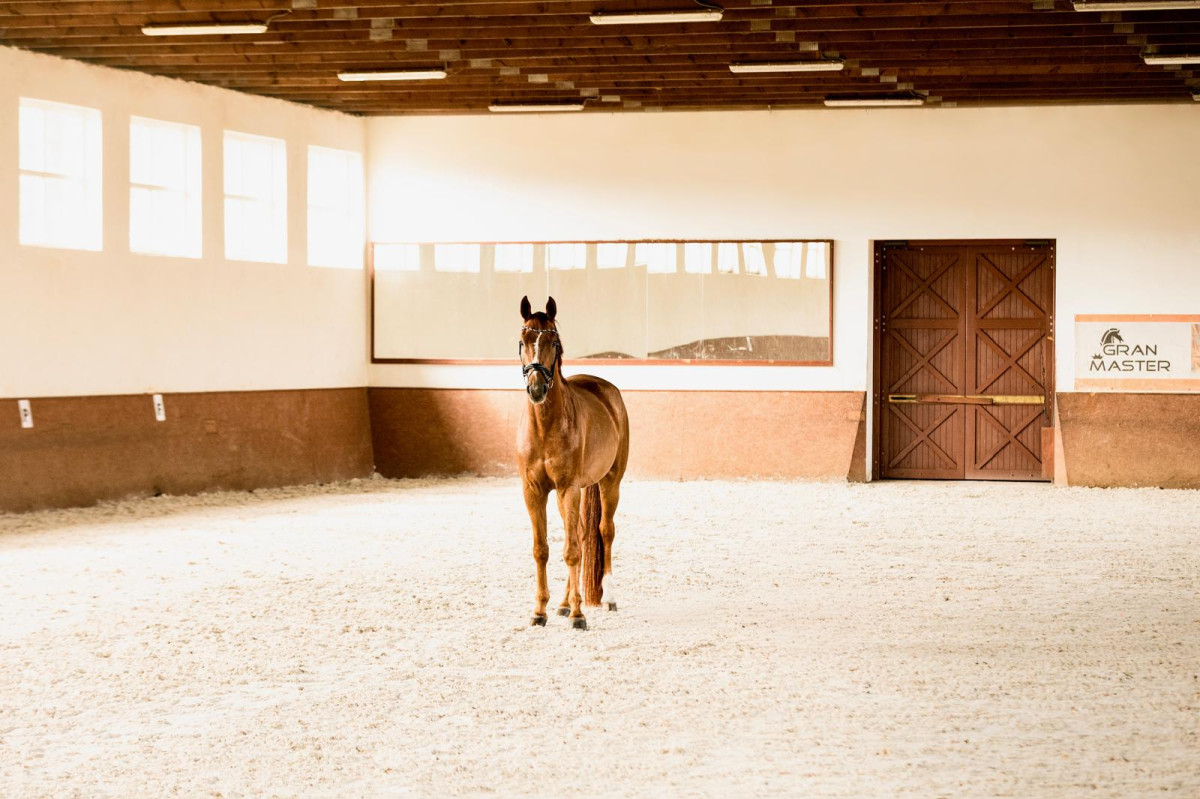 -kryta ujeżdżalnia z podłożem kwarcowym połączona bezpośrednio ze stajnią (20x45,5m),