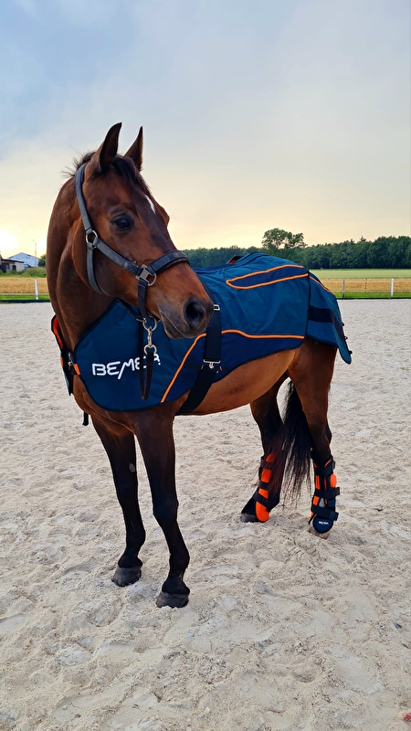 Derka w zestawie BEMER Horse idealnie nadaje się do zastosowań na dużych powierzchniach. Pole sygnału BEMER dociera do wszystkich newralgicznych miejsc na ciele konia. Derka ma ergonomiczny kształt, jest wyposażona w przepuszczające powietrze wkładki, a prosty mechanizm regulacji umożliwia bezproblemowe dopasowanie do budowy ciała konia. Zintegrowana kombinacja akumulatora i sterownika sygnału jest wydajna i umieszczona w miejscu łatwo dostępnym dla człowieka, ale nie dla konia. Drugim, bardzo praktycznym elementem zestawu Horse są dwa ochraniacze ze zintegrowaną kombinacją akumulatora i sterownika sygnału dla lewej i prawej strony, które można umieścić z przodu i z tyłu. Generują one silniejsze, bardziej skupione pole sygnału o działaniu miejscowym. Zestaw BEMER Horse uzupełnia praktyczna torba, derka osuszająca oraz ładowarka z kablem typu Y do jednoczesnego ładowania dwóch urządzeń sterujących; w zestawie znajduje się także międzynarodowy adapter.