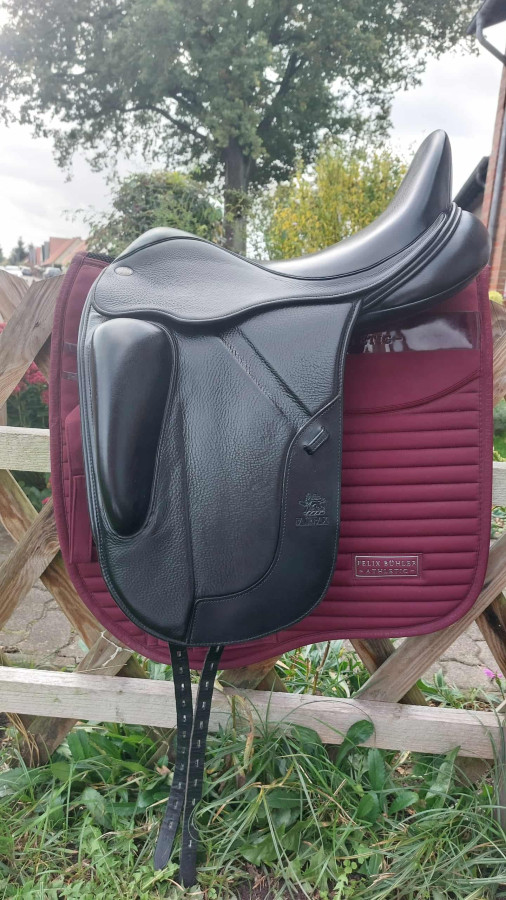 Siodło zaprojektowane z myślą o najwyższym komforcie jeźdźca oraz swobodzie ruchu konia. Głębokie siedzisko i dobrze wyprofilowane bloki zapewniają stabilną pozycję, a konstrukcja monoflap gwarantuje bliski kontakt z bokiem konia. Model ten ceniony jest w ujeżdżeniu za precyzję dopasowania i wsparcie biomechaniki ruchu.