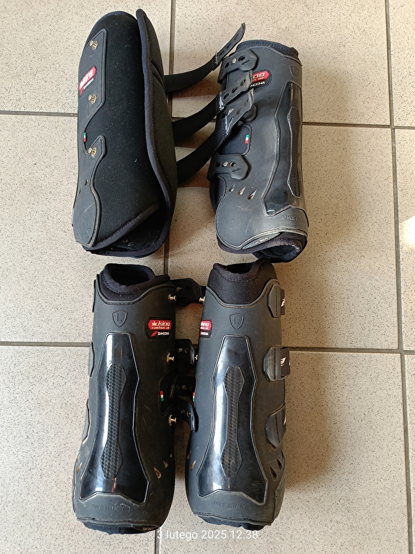 Używane- zostały profesjonalnie obszyte super mocną i elastyczną taśmą.W dwóch ubytek od wewnątrz, który nie przeszkadza w użytkowaniu. Sklepowo komplet ok 1500pln. Ochraniacze są czarne- mój telefon tak łapie kolor niestety. Proszę nie składać propozycji cenowych. Nie wymieniam się i nie wystawiam na olx i vinted.