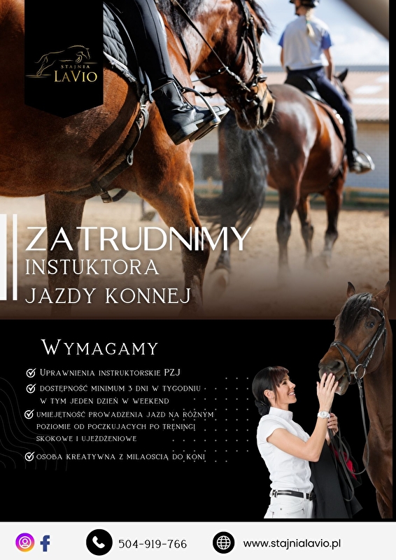 W związku z rozwojem stajni zatrudnimy instruktora jazdy konnej w stajni Lavio położonej w malowniczej lokalizacji w Anastazew 52 a (20 minut od Warszawy) szybki dojazd trasą S8.