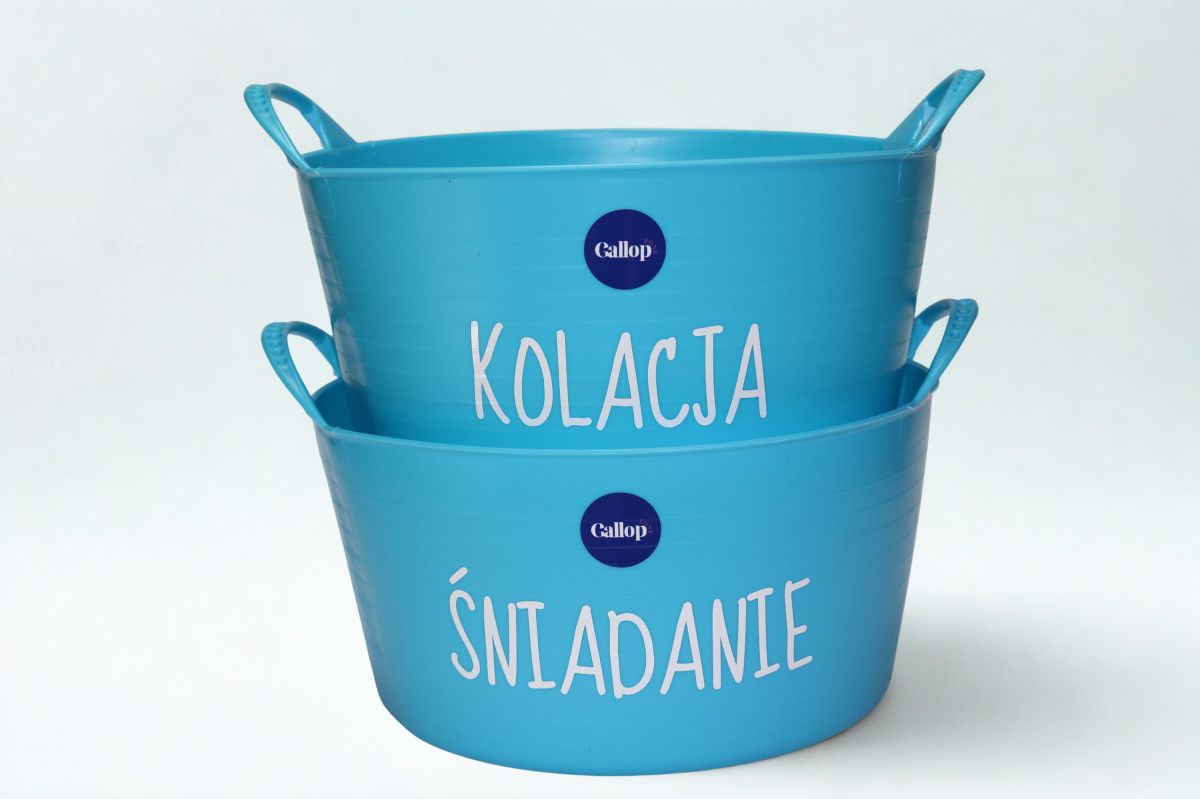 Zestaw 2 misek, Rano i wieczór, niebieski pojemnik dla koni na jedzenie Pojemność 14 l