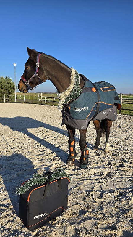 Derka w zestawie BEMER Horse idealnie nadaje się do zastosowań na dużych powierzchniach. Pole sygnału BEMER dociera do wszystkich newralgicznych miejsc na ciele konia. Derka ma ergonomiczny kształt, jest wyposażona w przepuszczające powietrze wkładki, a prosty mechanizm regulacji umożliwia bezproblemowe dopasowanie do budowy ciała konia. Zintegrowana kombinacja akumulatora i sterownika sygnału jest wydajna i umieszczona w miejscu łatwo dostępnym dla człowieka, ale nie dla konia. Drugim, bardzo praktycznym elementem zestawu Horse są dwa ochraniacze ze zintegrowaną kombinacją akumulatora i sterownika sygnału dla lewej i prawej strony, które można umieścić z przodu i z tyłu. Generują one silniejsze, bardziej skupione pole sygnału o działaniu miejscowym. Zestaw BEMER Horse uzupełnia praktyczna torba, derka osuszająca oraz ładowarka z kablem typu Y do jednoczesnego ładowania dwóch urządzeń sterujących; w zestawie znajduje się także międzynarodowy adapter.