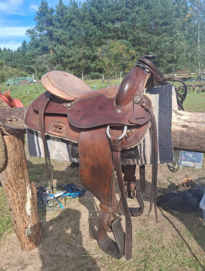 Zestaw western: siodło z osprzętem, pad, popręg, ogłowie.