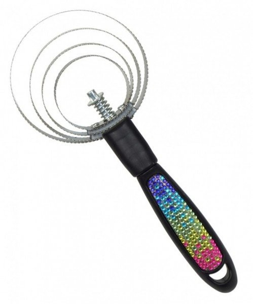 Metalowe zgrzebło z uchwytem zdobionym tęczowymi kryształkami.